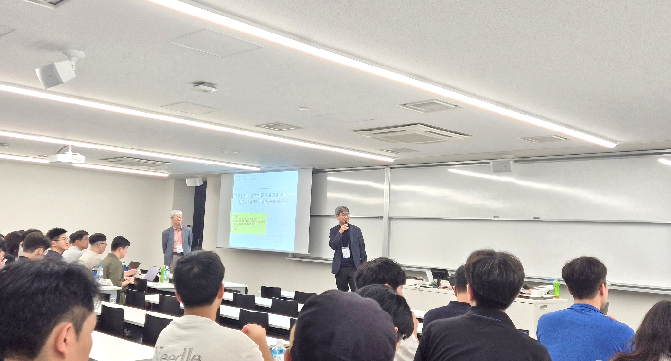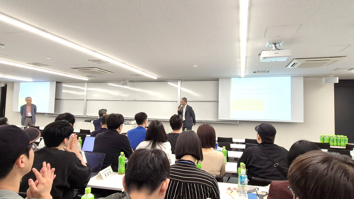 이어서 오후 시간에는 교토산업대학의 구승환 교수님의 강연으로 ‘일본 기업의 극복 전략과 혁신 기업의 기업자 정신 및 그 원류’라는 주제로 말씀하셨습니다. 구승환 교수님은 일본 유학 시절의 경험담을 시작으로 일본 경제가 위기 속에서 생존해 온 배경을 설명하셨고 대표적인 혁신 사례로 키엔스, 시마노, 닌텐도, 교세라, 다이킨 등을 소개하셨습니다. 또한 연간 300만 명 이상이 방문하는 시가현의 ‘La Collina’ 사례는 지역 소멸 위기를 관광과 지역 자원 연계로 극복한 경우라고 말씀하시면서 “성공한 일본 기업들은 전통을 지키면서도 끊임없이 변화를 수용하였고, 경영자부터 사원들까지도 사회 전체에 이로움을 주는 철학을 실천하고 있다.”고 말씀하셨습니다. 이러한 일본의 사례는 한국의 기업들에게 주는 시사점이 크며, 지속가능한 경영은 철학과 실행력이 합쳐질 때 완성된다고 강조하셨습니다.