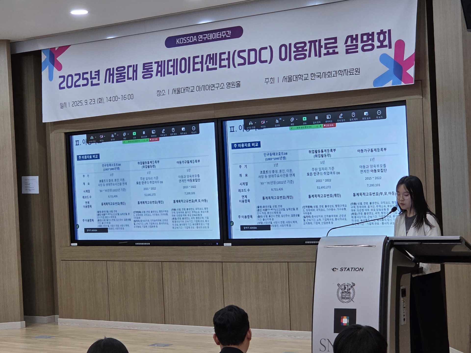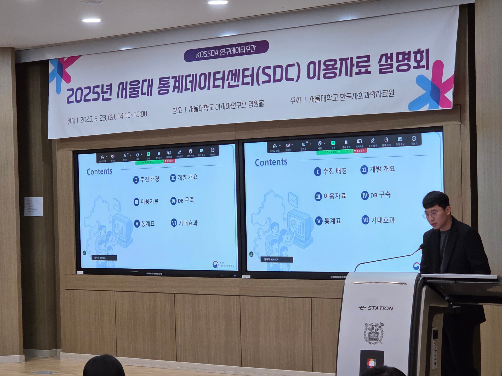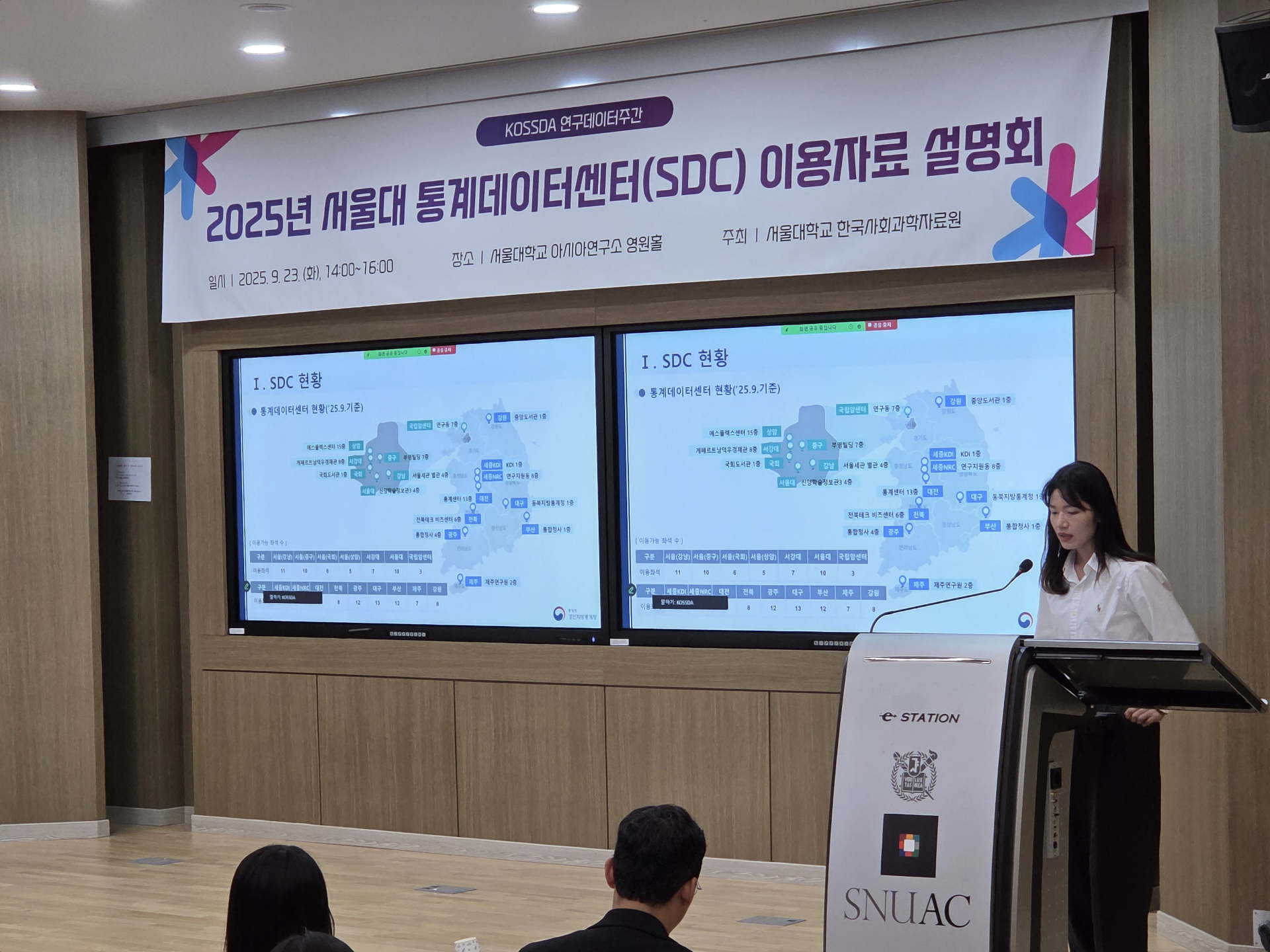 지난 9월 23일 화요일 오후 2시, 서울대학교 아시아연구소 영원홀에서 한국사회과학자료원이 주최하는 ‘2025년 서울대 통계데이터센터(SDC) 이용자료 설명회’가 열렸습니다. 작년에 이어 두 번째로 열린 이번 설명회는, 방대한 데이터 속에서 연구의 실마리를 찾고 있는 연구자들의 SDC 활용 문턱을 낮추기 위해 마련되었습니다.