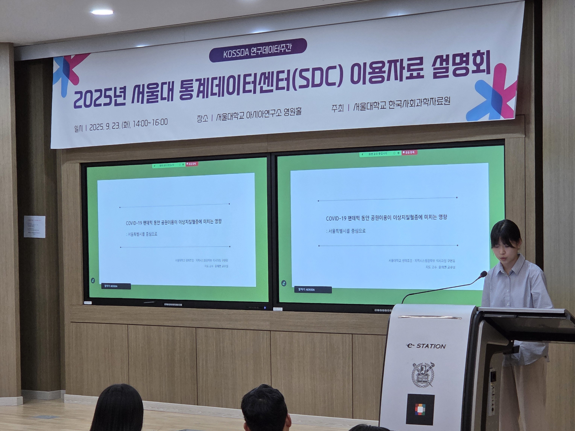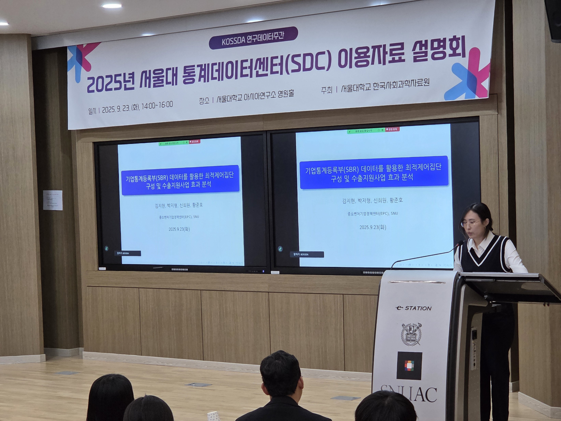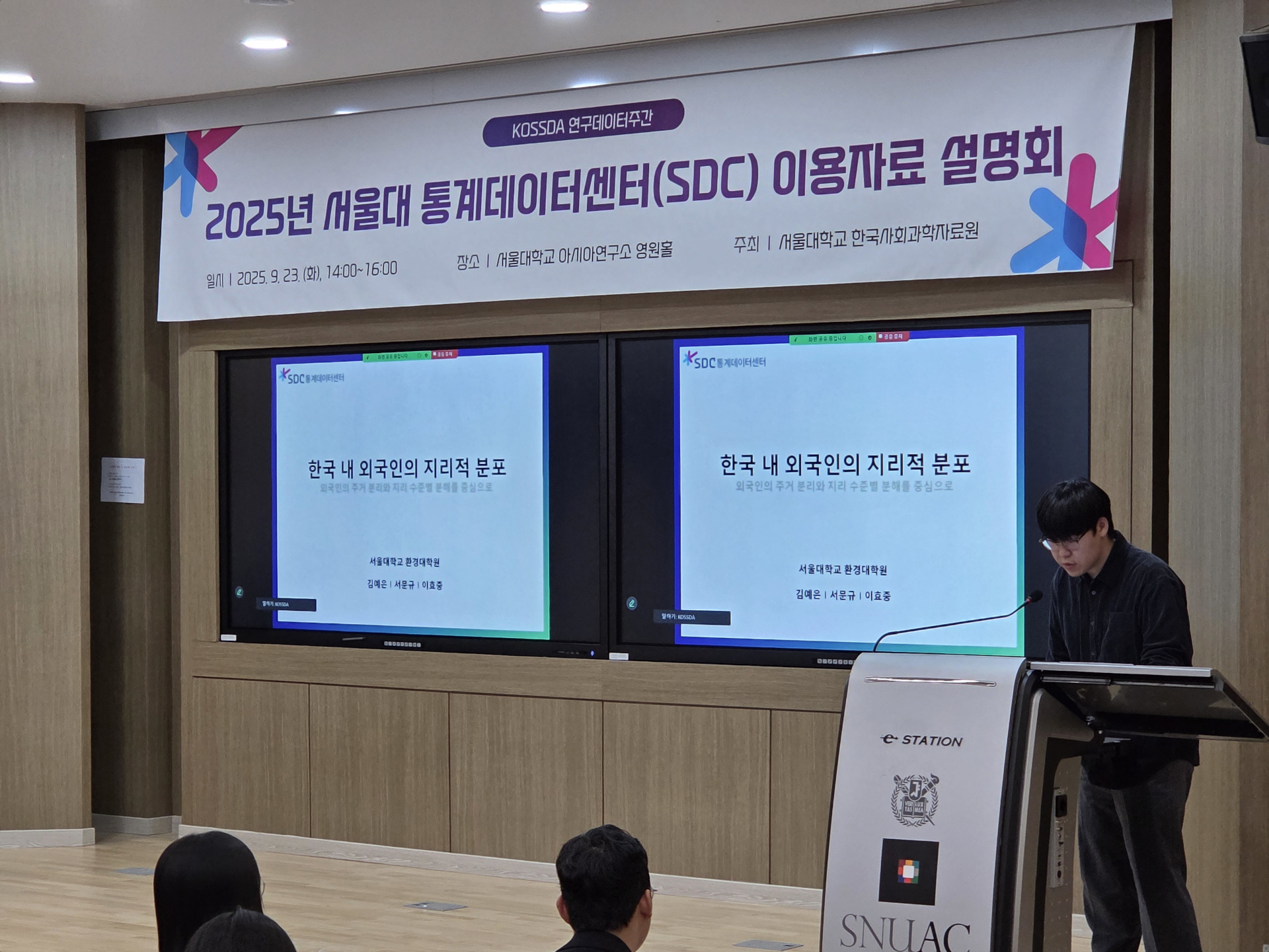 지난 9월 23일 화요일 오후 2시, 서울대학교 아시아연구소 영원홀에서 한국사회과학자료원이 주최하는 ‘2025년 서울대 통계데이터센터(SDC) 이용자료 설명회’가 열렸습니다. 작년에 이어 두 번째로 열린 이번 설명회는, 방대한 데이터 속에서 연구의 실마리를 찾고 있는 연구자들의 SDC 활용 문턱을 낮추기 위해 마련되었습니다.